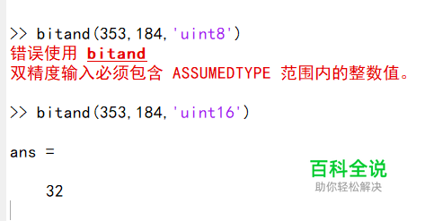 bitand可以有第三个参数:假设的类型。'uint8'表示将前两个参数转为uint8类型。 注意,传入参数可以是整浮点型或者整型,但是需要在假设类型的范围内。 如图,假设了'uint8'就意味着参数范围应该在0~255
