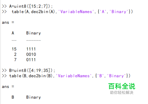 首先,我们构建两个类型为uint8的列表A和B,用来稍后的演示。 使用dec2bin函数以显示二进制。
