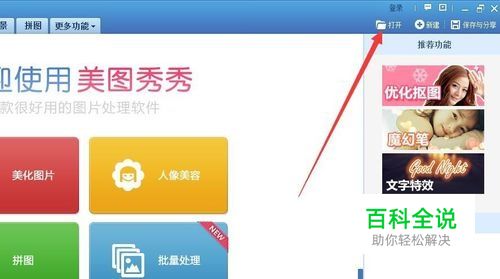 打开电脑的美图秀秀之后,点击美图秀秀右上角的打开选项,打开你需要改变形状的图片即可。