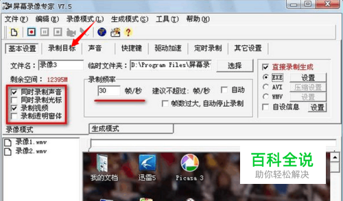 接着我们要进行设置过。 这里,我们要勾选“录制视频”和“同时录制声音”。软件推荐的帧速率为15-20,但是经我实际测试,30帧/秒可以得到比较流畅的画质,所以这里我们设置成30,也无需再高了。注意把帧率后面的“自动”去掉。另外还需要设置“录制文件夹”,也就是录制过程的缓存和录好的文件保存的地方,要选一个足够大的文件夹,并且不要在C盘。