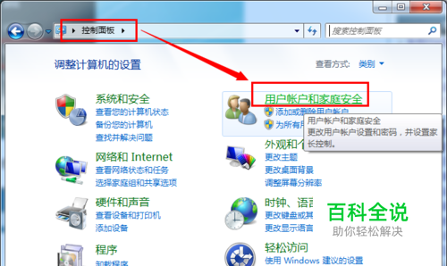 打开“控制面板”,点击“用户账户和家庭安全”项进入。