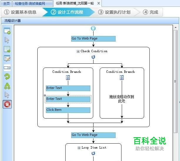 然后就到了设计采集流程的界面,这个界面看起来复杂,其实很简单,我们先看上面一半,包括第一个 Go to Web Page, 和Check Condition 里面的全部流程步骤。其实他们完成一个什么工作呢?就是打开微博登录页面,然后检查用户是否登录,如果没有登录,则走左边流程,三步:输入用户名,输入密码,点击登录。如果已经登录,则走右边流程:什么事情都不做。为什么需要登录呢,如果不登录,则只能看到一页数据,登录后就能看所有数据,所以我们想要采集所有数据,就要登录。下半部分流程因截图不全,所以请大家看第三步。