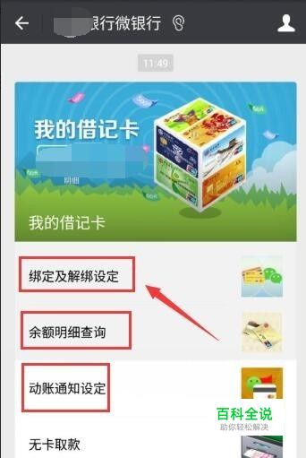 进入后,在界面下方有多个菜单,可以逐一展开,这里展开了第一项,有借记卡功能,点击后,稍等一会,即可收到新消息。