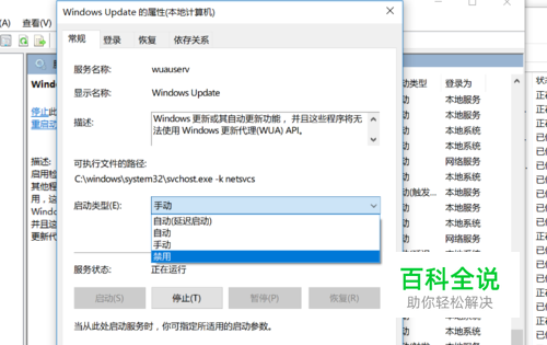 进入弹窗之后,我们在常规窗口下面找到启动类型,系统默认的类型是手动类型,我们在这里将其设置为禁用,点击出现下拉窗口, 点击禁用。