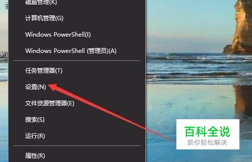 在Windows10桌面右键点击开始按钮,在弹出菜单中选择“设置”菜单项