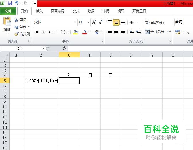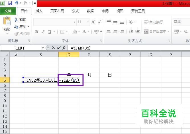 我们点击年下面的单元格,然后在里面输入=YEAR(B5),之后按回车键,就可以得到年了;
