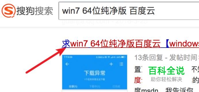打开搜狗搜索,输入‘win7 64位纯净版 百度云’进行搜索,点击打开第一个结果页面。