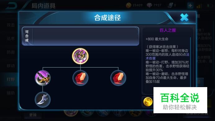 第一件,巨人之握 这件打野装备击杀野怪可以增加伤害和获得更多的经验,同时可以通过击杀野怪叠加生命值,能让达摩在前期快速发育,并且还能增加法术伤害。