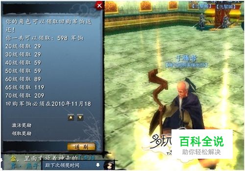 第一步:领取帐号回购奖励 奖励内容:最低30元,50%消费返还 帐号回购活动自然是奖励中最重要的部分。只要是8月1号以后没有登录过游戏的30级以上的玩家,都可以在官网查询自己可以领到的军饷和回流奖励:【查询地址】 然后登录游戏,新建一个小号,在人物头像下的奖章图标里,“官方活动奖励”类别中的“2010帐号以旧换新”中,就可以领到帐号回购奖励了。其中军饷部分,角色每升10级后就可以到九黎太守区找NPC“于腾哲”领取一次,总金额高达消费总额的50%。