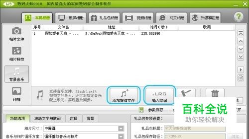 为相册配上动听的音乐、添加歌词字幕 精美的视频相册还需配上动听的背景音乐,分别点击下图的“添加媒体文件”按钮和“插入歌词”按钮,即可为相册配上一段音乐,并为音乐配上同步MTV歌词,使制作出的视频像明星的音乐MTV一样,还能实现以歌词传意的效果。