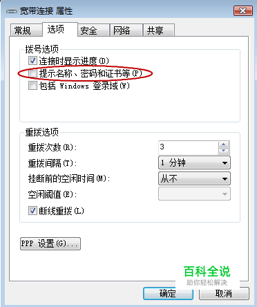 点开选项这张卡 -> 把提示名称密码和证书等前面的勾去掉 -> 确定,以后登录进去 5 秒钟后它便会自动拨号