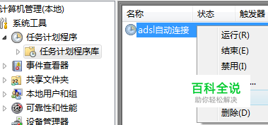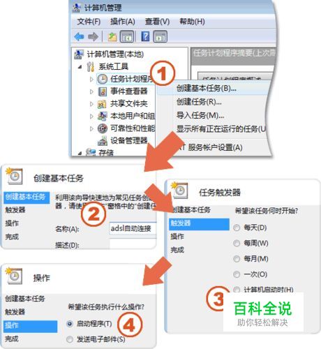 打开计算机管理控制台:开始 -> 右键计算机 -> 管理;点一下计划任务程序,然后再右键点它一下,选创建基本任务。在名称里面随便打个名字,比如“ADSL自动连接”,然后下一步。 选当前用户登录时,点下一步。选启动程序(应该已经选中了),点下一步