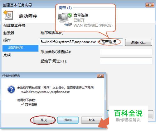 在程序或脚本下面输入 %windir%\system32\rasphone.exe -d 宽带连接的名称,然后下一步。这个名称就是你平时常用的拨号连接的名称。下面这张图中,连接名称是“宽带连接”所以输入的是“%windir%\system32\rasphone.exe -d 宽带连接”