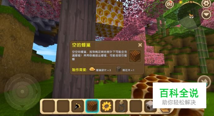 在找到蜜蜂后,我们需要制作一些蜂巢来驯服蜜蜂,因为我们是不可以到野生的蜂巢中去采集蜂蜜的,我们只能到我们制作的蜂巢中采集蜂蜜。蜂巢是由三个蜂巢碎片和一个桃花木制作完成的。桃花木很容易获得,直接用斧头砍伐即可,蜂巢碎片需要我们击碎蜂巢来获得。