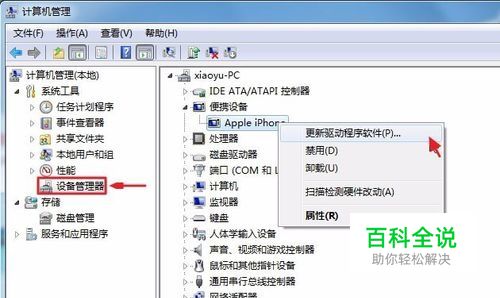 2.然后依次找到“设备管理器—便携设备—右键点击Apple iPhone—更新驱动程序软件”,如图2 没有“便携设备”选项的,找“设备管理器—通用串行总线控制器—右键点击Apple Mobile Device USB Driver—更新驱动程序软件”,如图3