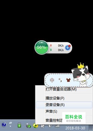 首先,我们现在桌面右下角右键点一下那个小喇叭图标,在弹出的对话框中单击“录音设备”