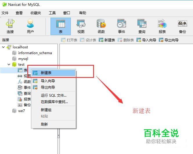 打开Navicat for MySQL,找到一个数据库,然后右键单击表,选择新建表选项,如下图所示