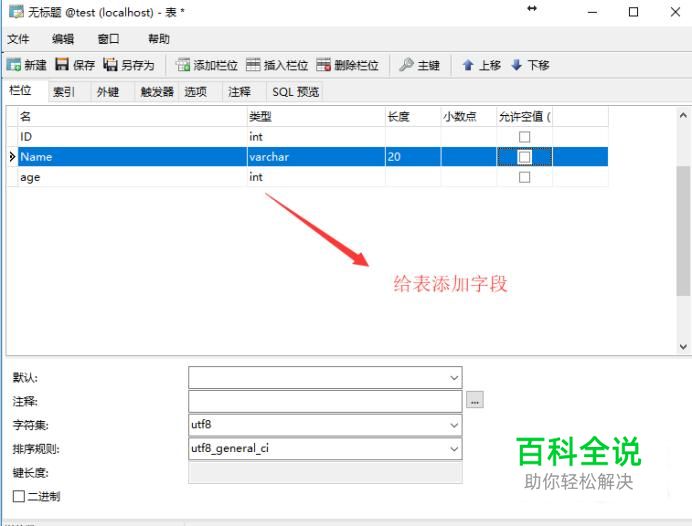 在弹出的新建表界面,我们给表建一些字段,如下图所示,建好之后保存即可
