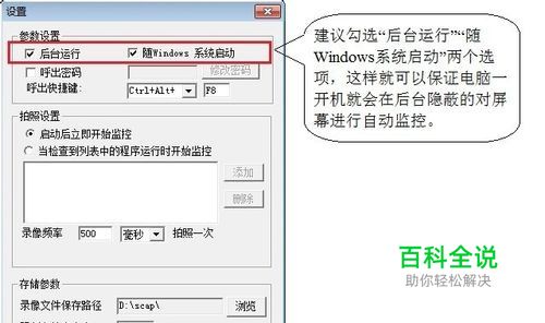 首先“后台运行”“随Windows系统启动”这两个选项一定要勾选,勾选了才能保证电脑一开机屏幕自动录像器就在后台运行,进行屏幕监控录制。