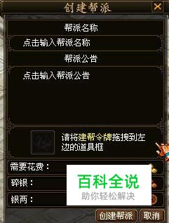 3、将建帮令牌拖到左边的道具栏中,然后点击创建帮派。建帮费用优先扣除碎银,碎银不足的从银两中扣除。系统判断帮派名字未重名且合法后,帮派进入响应阶段。响应者满5人(系统默认创建帮派者为第一响应人,界面显示响应人数1/6)则帮派正式成立,否则,24小时后帮派申请失败,手续费100金和建帮令牌不退。