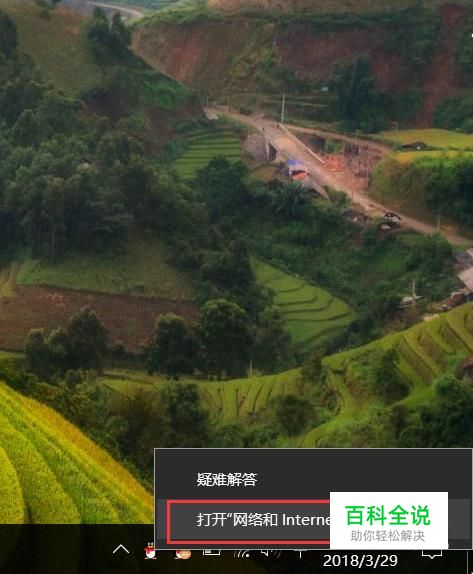 首先,在Windows桌面任务栏中,对着网络图标击右键,选择“打开网络和Internet设置”菜单。