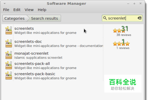 在“软件管理器”窗口的右上角的搜索框中输入“screenlet”(不带引号)。您不需要按Enter键,因为您键入时显示结果。在显示的列表中单击“screenlets”。