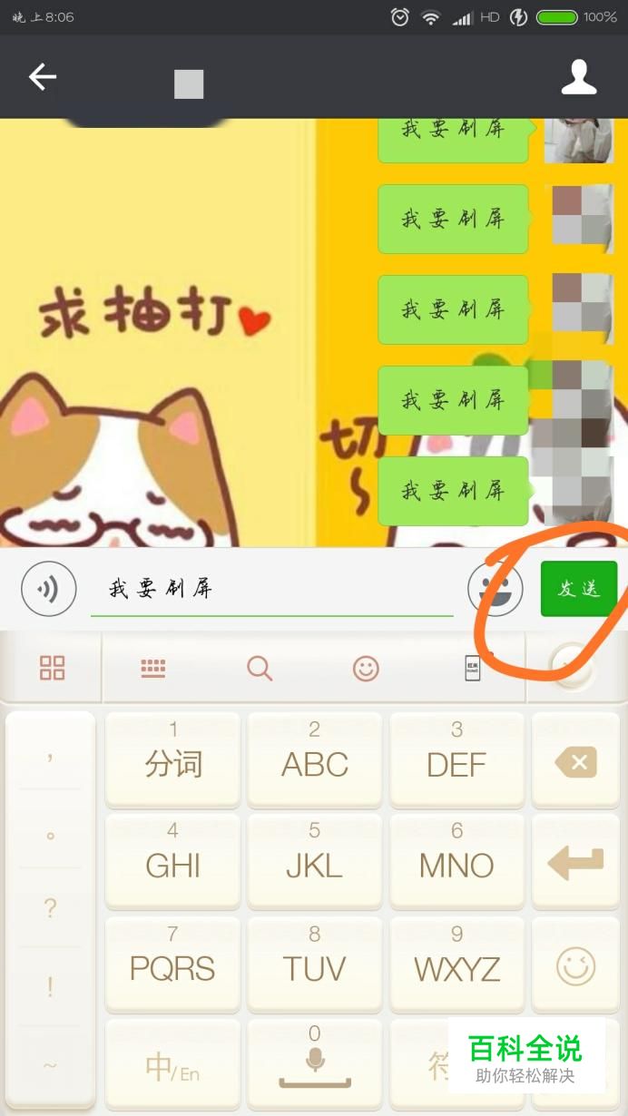 输入你想要刷屏的文本,然后点击“发送”
