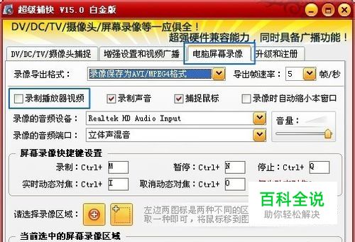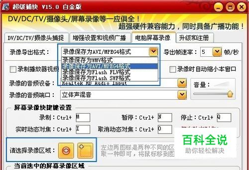 设置录制游戏解说视频的具体参数 在“录像导出格式”处,选择录制的游戏解说视频要保存的格式,在“请选择录像区域”处,可以精确选择录像区域。