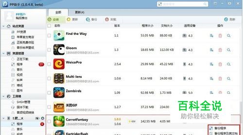 用PP助手(Win)或(iOS)版备份程序(可以备份程序及其文档)