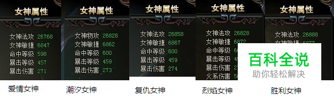 爱情、潮汐、复仇、烈焰、胜利,这是偶乐女神联盟最顶尖的5个女神,下面来看看几个女神的属性和光环吧。 可以看出胜利女神是最优越的,敏捷和攻击成长是女神之最,可获取太难,只有跨服争霸的前10才能获取。其次烈焰属性不错,50的额外火系攻击也可以随进 化和等级成长,可惜光环前排是生命和命中,对很多玩家来说布阵比较不方便,获取的方式是幸运转盘1000分,小R玩家就可以拿到手。 再次是复仇女神,该女神可以算是性价比极高的了,属性和光环都是顶尖,通过万圣节活动获取也不困难,日后如果有活动产出,玩家不要错过。 潮汐可以算是免费的女神,资质成长光环都不错,但技能属于物理攻击,还是不如法术攻击PK的伤害高。爱情女神是前中期过渡的最佳女神,目前通过幸运转盘获取并不难。