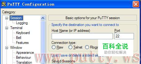 打开putty.exe,配置好远程主机B的IP和端口,B是一台LINUX主机。如下图空白处前面是IP,后面是端口。