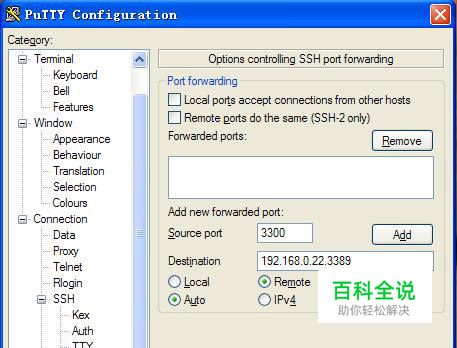 配置端口转发,打开putty,点击左侧的Connection->SSH->Tunnels,配置如下。Source port是客户端A端口号,这个随便设置一个。Destination栏填写远程局域网内C主机IP和端口。然后点击Add。配置完成后,点击下边的Open,首先建立一个到远程主机B的连接并登录。