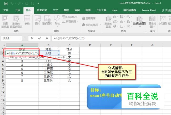 在A2单元格输入公式“ =IF(B3<>"",ROW()-1,"") ”,根据B列的内容来自动生成序号