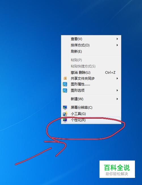 在桌面没有图标的地方,单击鼠标右键,会出现一个列表,选中最下方的”个性化“。