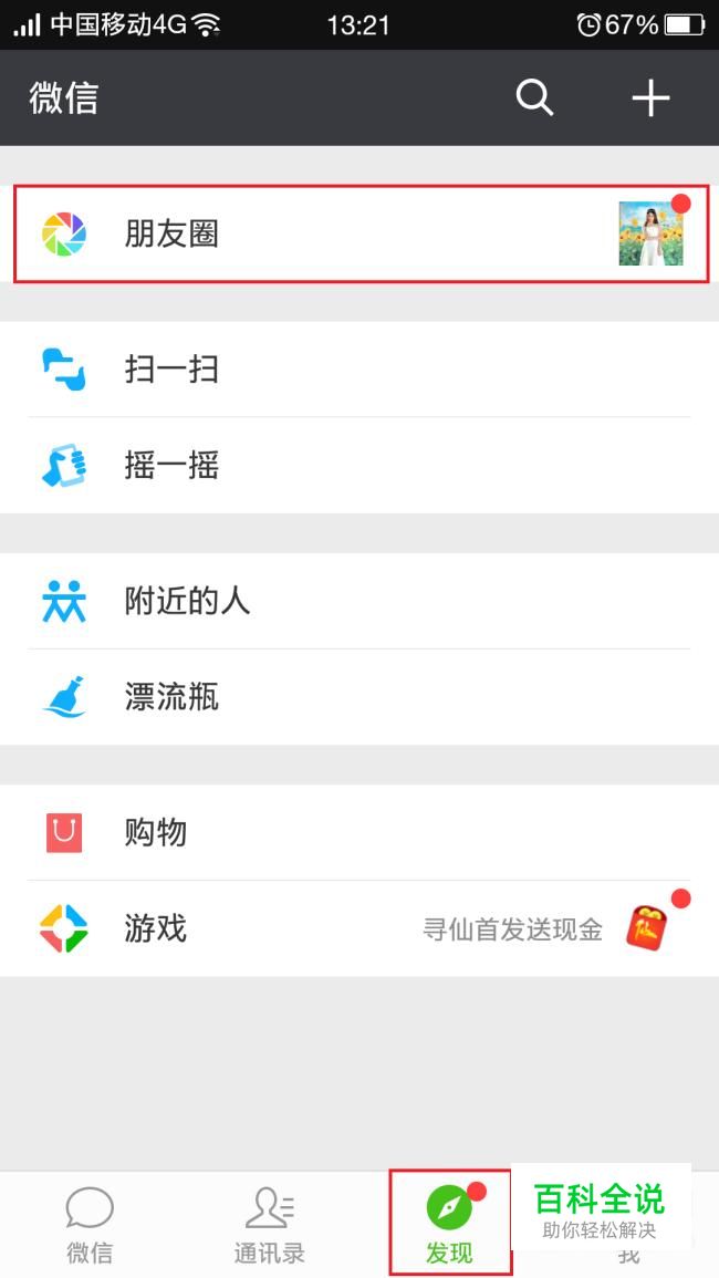 我们打开微信,进入主界面,在主界面的下方我们点击【发现】,转换到发现界面,在发现界面中,我们点击上方的【朋友圈】。