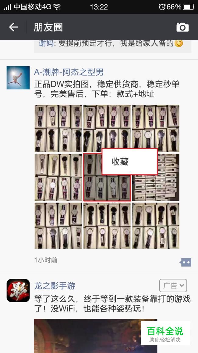 进入朋友圈以后呢,我们就需要选择自己想要转发的信息了,我们以图片为例,我们选择好要转发的图片后,用手指长按图片,弹出【收藏】指令,点击收藏。
