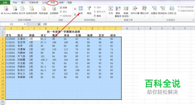 以下面的学生成绩表为例,因为要对学生班级成绩进行分类汇总,所以先要按照班级对表格进行排序。找到菜单栏中的“数据”选项,点击“排序”。