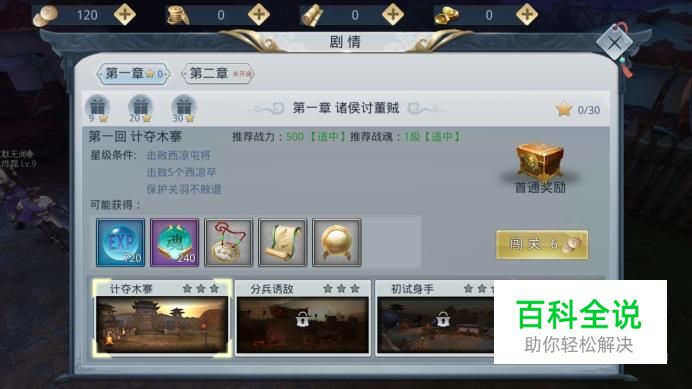 在剧情弹框中,选择需要进行的关卡,确定推荐战力等信息,点击“闯关”