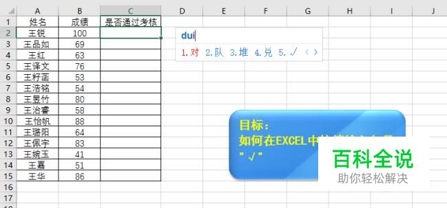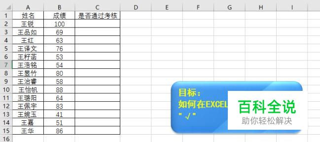 根据成绩,如果成绩大于或等于80分的话,我们在成绩后面的单元格中输入√号