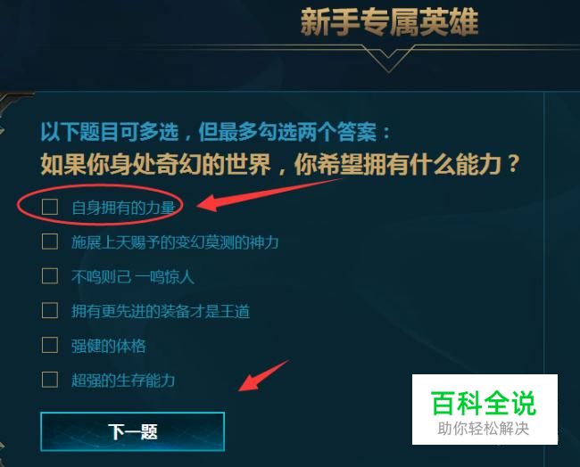 然后将页面下滑,可以看到领取专属英雄的题目,第一题选择“自身拥有的力量”,点击下一题。