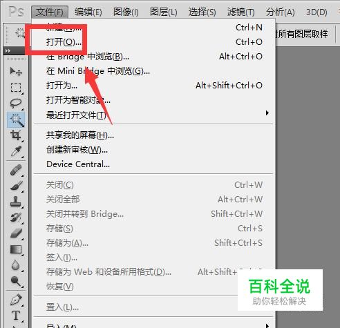 打开ps软件。需要将图片在ps中打开,点击界面左上角的“文件”,再点击列表中的“打开”选项。