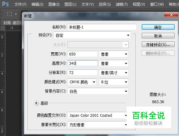 新建一个文档,将尺寸设为:650x340(根据需求设定)。