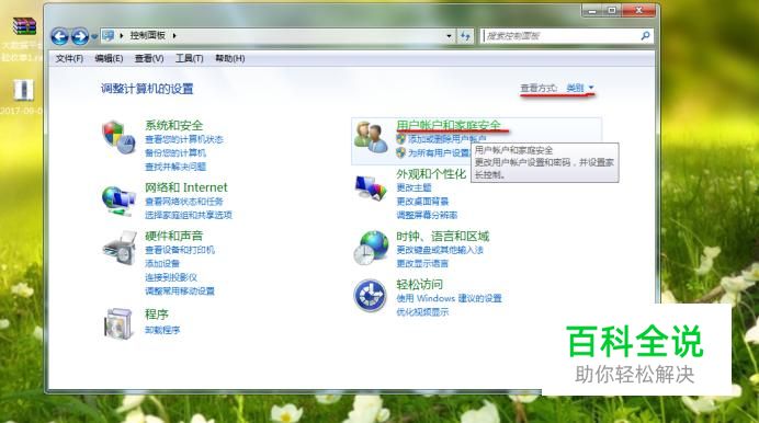 选择查看方式“类别”,找到“用户账号和家庭安全”点击进入