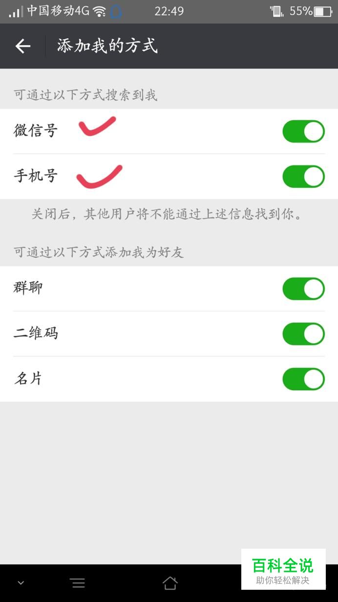 添加方式里面有:微信号、手机号、有的还有QQ号,都是开启状态。