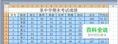 框选出我们需要筛选的数据的所有单元格,不要把标题(某中学期末考试成绩)选中,因为这里是合并单元格,选中会出错的;