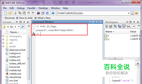 采用以下指令生成我们的数据,指令如下; t=0:.01:2*pi; y=sin(t).*cos(9*t)+sin(15*t);