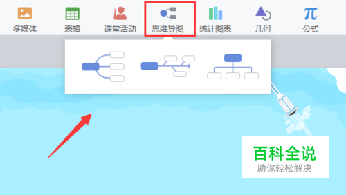 打开希沃白板5,“新建课件”,进入课件编辑界面,点击“思维导图”。思维导图有3种类型,根据需要选择适合的类型。以第一个为例,方法是相同的,举一反三。