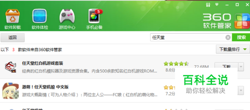 玩这些游戏我们要用到nes模拟器,和nes游戏,在360软件大全上有全套的东西,比较方便,我们可以在那直接下载安装。我们可以搜索任天堂,就出来了。