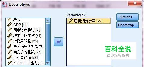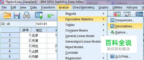 要想按照标准差筛选数据,必须先要求出每个数据的Z分数,如图所示,在菜单栏上执行analyze--descriptive statistic--descriptive,打开描述统计对话框