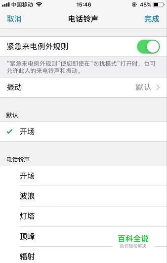然后回到联系人电话页面,就可以看到电话铃声那里显示 已打开紧急来电例外规则,别忘了右上角还要再点击 完成哦,如下图